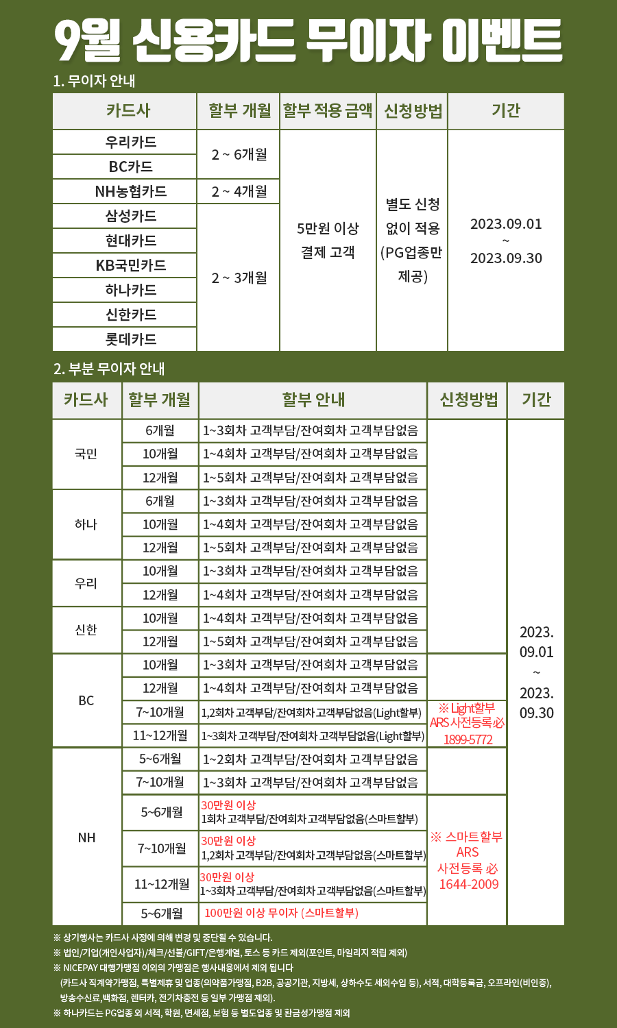 9월 신용카드 무이자 할부안내
